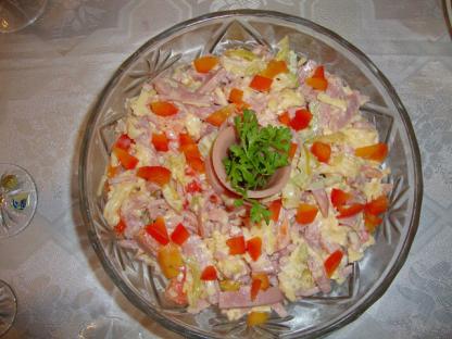 3 Смешайте подготовленные ингредиенты и зеленый горошек в салатнике, посолите по вкусу. Перед подачей на стол заправьте майонезом.