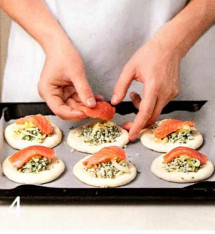 3 . Малосольную рыбу нарежьте тонкими ломтиками. Тесто разделите на кусочки размером со средний абрикос. Раскатайте в кружки толщиной 1 см и дайте немного расстояться.