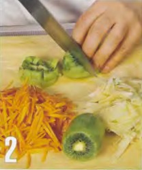 2 . Морковь очистите а у яблока удалите сердцевину. Нарежте морковь и яблоко соломкой. Киви очистите от кожуры и нарежьте небольшими кусочками.