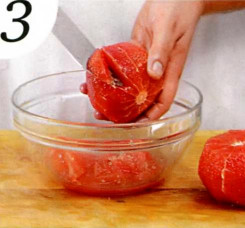 2 . Острым тонким ножом срежьте у грейпфрутов верх и низ, затем установите вертикально и срежьте кожуру вместе с белой пленкой, чтобы стала видна мякоть.