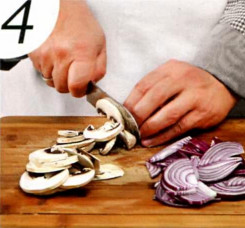 4 . Луковицу очистите и нарежьте тонкими полуперьями. Шампиньоны протрите салфеткой. Удалите у шампиньонов ножки (они не понадобятся), шляпки нарежьте тонкими ломтиками.