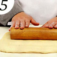 5 . Выложите форму для кекса промасленным пергаментом. Готовое холодное тесто раскатайте на присыпанной мукой поверхности в прямоугольник размером 15x30 см.