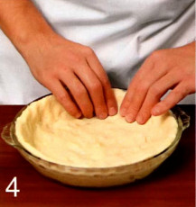 4 . Тесто разделите на 2 равные части и раскатайте. Смажьте форму для пирога диаметром 24 см маслом и застелите одним пластом теста, чтобы получилось донышко с бортиками.