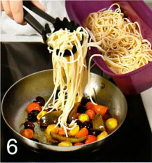 | Время приготовления : 30 минут | | Количество порций : 4 штуки | Готовим спагетти с помидорами Вам понадобится : 400 гр.спагетти, 200 гр. помидоров черри, 2 сладких помидора лучше сорта кумато, 1 банка маслин лучше сорта каламата, (400 гр.) 4 куска черствого белого хлеба с семечками, 4 зубчика чеснока, оливковое масло, соль, черный перец  | 1 . У хлеба удалите корки и нарежьте мякиш кубиками. Положите их на силиконовый коврик и подсушите в разогретой духовке. Переложите хлеб в комбайн, измельчите в крупную крошку. |  | 2 . Очистите и раздавите чеснок с помощью «Чудо-чесночницы». Добавьте к хлебным крошкам половину чеснока и перемешайте. |  | 3 . Разогрейте в сковороде (24 см) 3 ст. ложки оливкового масла. Положите крошки с чесноком, посолите, подрумяньте, непрерывно перемешивая силиконовым скребком |  | 4 . Положите спагетти в контейнер «Паста-Браво», залейте холодной водой, поставьте в микроволновую печь, установите мощность 600 Вт и готовьте 10 минут. |  | 5 . Маслины раздавите на разделочной доске, удалите косточки. Нарежьте помидоры черри половинками, а кумато - ломтиками. |  | 6 . Оставшийся чеснок и помидоры положите в сковороду, долейте немного масла. Готовьте на сильном огне, помешивая 1 минуту. Помидоры не должны поджариться. Добавьте маслины, снимите с огня, полейте небольшим количеством масла, приправьте перцем и перемешайте. Разложите спагетти щипцами для спагетти по подогретым тарелкам, сверху выложите помидоры с маслинами, полейте соком и посыпьте хлебными крошками. | Предлагаем посмотреть рецепты на пасху: |