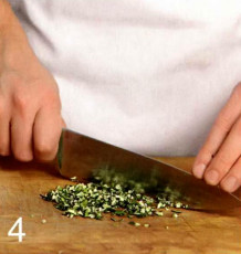4 . Удалите у базилика веточки (они не понадобятся). Отложите красивые небольшие листочки для подачи. Остальные листочки мелко порубите вместе с примерно половиной кедровых орехов.