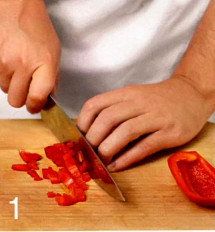 1 . Картофель очистите и нарежьте небольшими дольками. Лук и чеснок очистите и измельчите. Сладкий перец разрежьте вдоль пополам, удалите перегородки и семена, мякоть нарежьте маленькими кубиками.