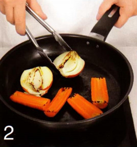 2 . Пока бульон закипает, разрежьте луковицу, корень петрушки и морковь вдоль на 2 или 4 части и поджарьте разрезом вниз на сухой сковороде до коричневого цвета.