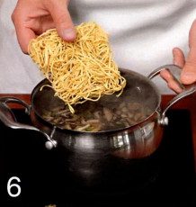 6 . Влейте бульон в кастрюлю, доведите до кипения, добавьте грибы с луком, чесночную заправку, вино и соевый соус. Варите 2-3 минуты. Добавьте лапшу и варите согласно инструкции на упаковке. Перед подачей всыпьте измельченный лук (зеленую часть).