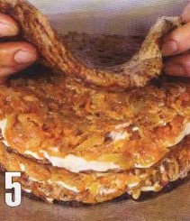 | 1 . Говяжью печенку тщательно вымыть. Поместить в теплую воду на 5 минут Затем поднять с одного угла пленку к снять ее. прижимая кусок печенки ножом или рукой.Разрезать печенку на куски удалив все желочные протоки |  | 2 . Подготовленную почонку пропустить через мясорубку и размельчить в блендере,или пропустить несколько раз через мясорубку,пока не получится однородная маса. |  | 3 . Переложить всю получиную масу в миску и добавить яйца молоко и тщательно перемешать . |  | 4 . В сковородке диаметром 18-20 см рэзогреть 1 ст. л растительного масла.Переложить часть печоночной масы в сковордкуи разровнять её так чтобы она покрывала небольшим слоем всю сковородку как блин,жарить 2-3 минуты после чего перевернуть на другую сторону и жарить ещё 2-3 минуты,также жарить и остальные блины. |  | 5 . Лук и морковь очистить, нашинковать и обжарить в растительном масле. Переложить в миску прижать крышкой или тарелкой и, наклонив спить лишнее масло. Печеночный блин смазать майонезом по вкусу. Сверху положить слой жареной моркови и лука и накрыть следующим блином 1 . слоёное тесто 2 . сырная смесь 3.груши 4.сырная смесь 5.слоёное тесто |  | 6 . Повторить операцию: пока не будут использованы все блины печеночный торт намазать не толстым слоем майонеза сверку и по бокам.Поставить торт в разогретую до 180°С духовку на 15 минут. |
