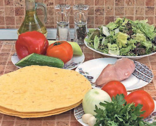 | 16 . Смешать филе, перец, помидоры, огурцы, салат, порей |