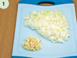 | 1 . Готовим соус. Лук и чеснок мелко нарежьте. |