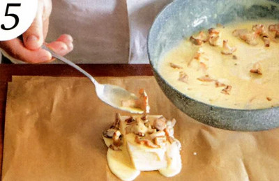 5 . Нарежьте бумагу для запекания на куски 30x40 см. В центр каждого куска положите филе трески, на него - соус с лисичками.