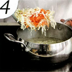 2 . Тем временем нарежьте пекинскую капусту довольно тонко, удалив кочерыжку (она здесь не понадобится). Морковь очистите и натрите на крупной терке.