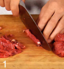 1 . Вырезку положите в морозильник на 15-20 минут (так ее будет легче нарежьте). Затем нарежьте мясо тонкими полосками длиной примерно 4 см.