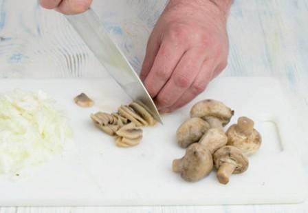 4. Отварите грибы. Нарежьте их тонкими пластинками, а лук — полукольцами.