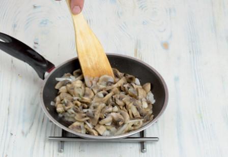 5 . Обжарьте на растительном масле лук вместе с грибами. |
