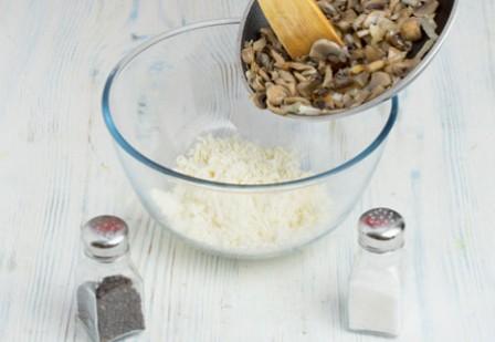 7 . Приготовить начинку: смешать обжаренный лук, грибы, сыр, черный перец и соль.